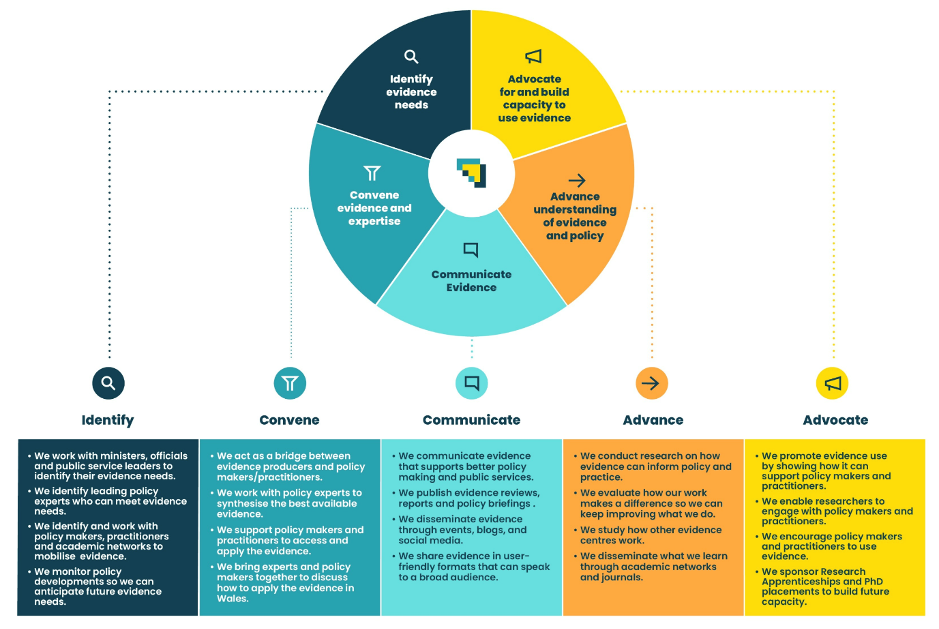 The Wales Centre for Public Policy (WCPP) at Cardiff University is a UK What Works Centre that works with leading policy experts to provide ministers, the civil service, and public services in Wales with independent and authoritative evidence and expertise. We provide outputs such as evidence reviews and policy briefings and use roundtables to bring together experts and decision-makers to resolve evidence needs. WCPP has a dedicated research team, which was rare for a Knowledge Brokering Organisation (KBO) when it was set up in 2017.