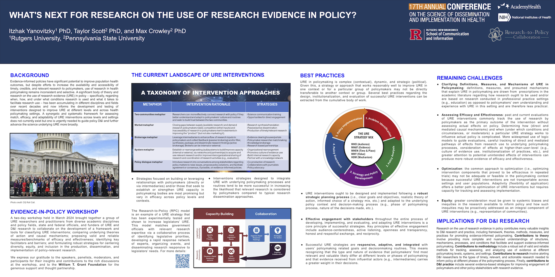 Itzhak Yanovitzky (Rutgers University), Taylor Scott (Penn State) and Max Crowley (Penn State). Find out more about the workshop at https://evidence2impact.psu.edu/wtg-research-to-policy-workshop/.